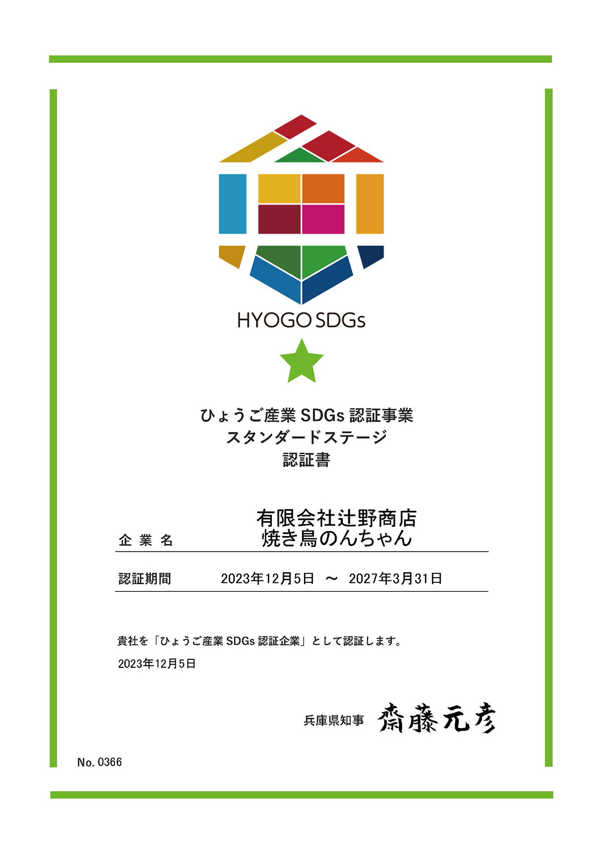 この度、焼き鳥のんちゃん こと 有限会社辻野商店は、「ひょうご産業SDGs認証」の「スタンダードステージ」に認証されました。
